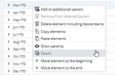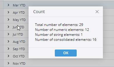 When right clicking on an element in modeler and selecting count, it always shows the details for the whole dimension. As you already have this information on the dimension properties tab, this dialog should show information about the individual element selected.