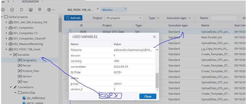 The idea is that the user is able to copy execution variables from the "Used variables" in the executions list to the Variable in Integrator.