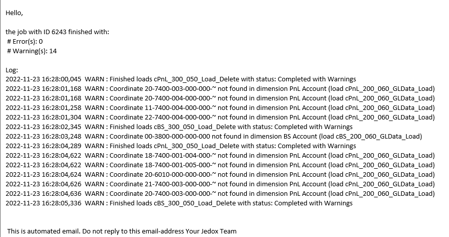 I'd like to see some log information in my E-mail from Scheduler, i.e. i'd like to see any warnings executing my job. I can not find a template/variable for that in https://knowledgebase.jedox.com/jedox/maintenance/scheduler-email-templates.htm