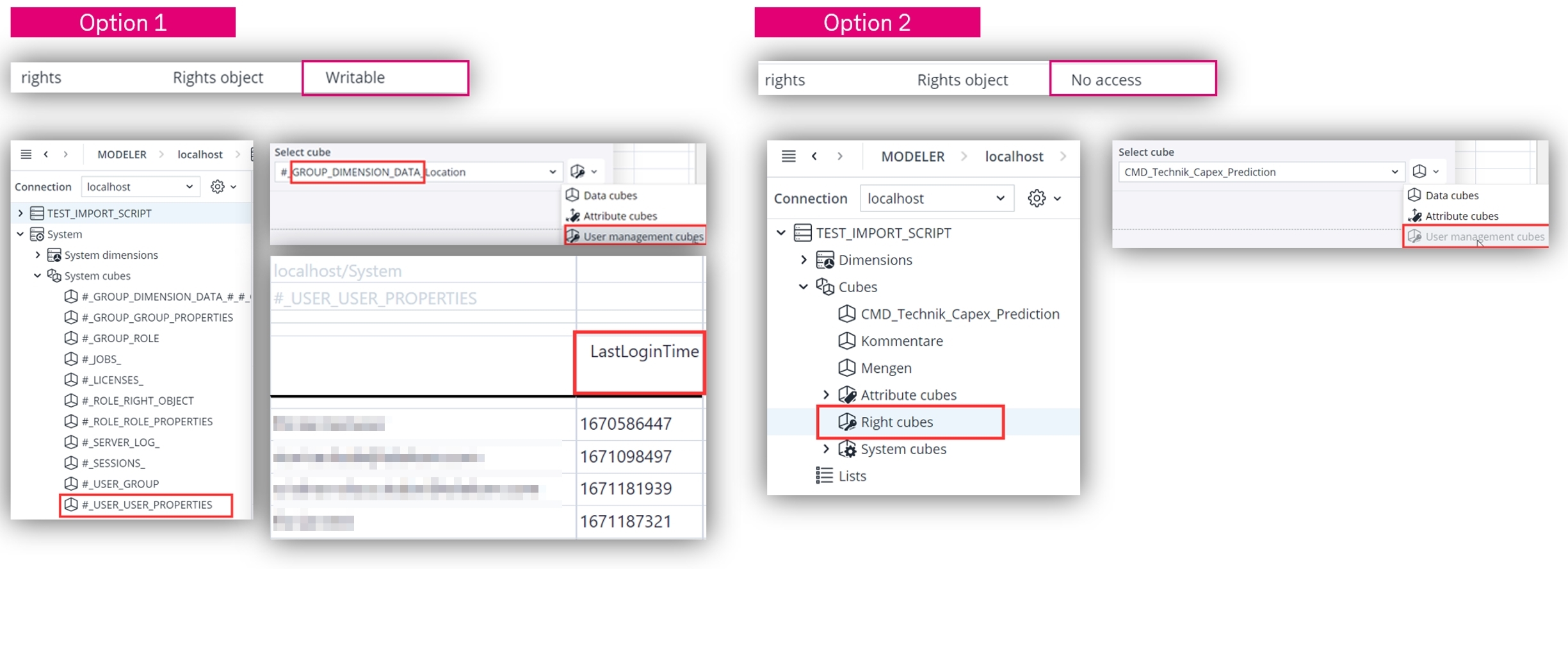 • The user is not able to access the User management cube within one database to restrict/give access to content security (elements within one dimension)