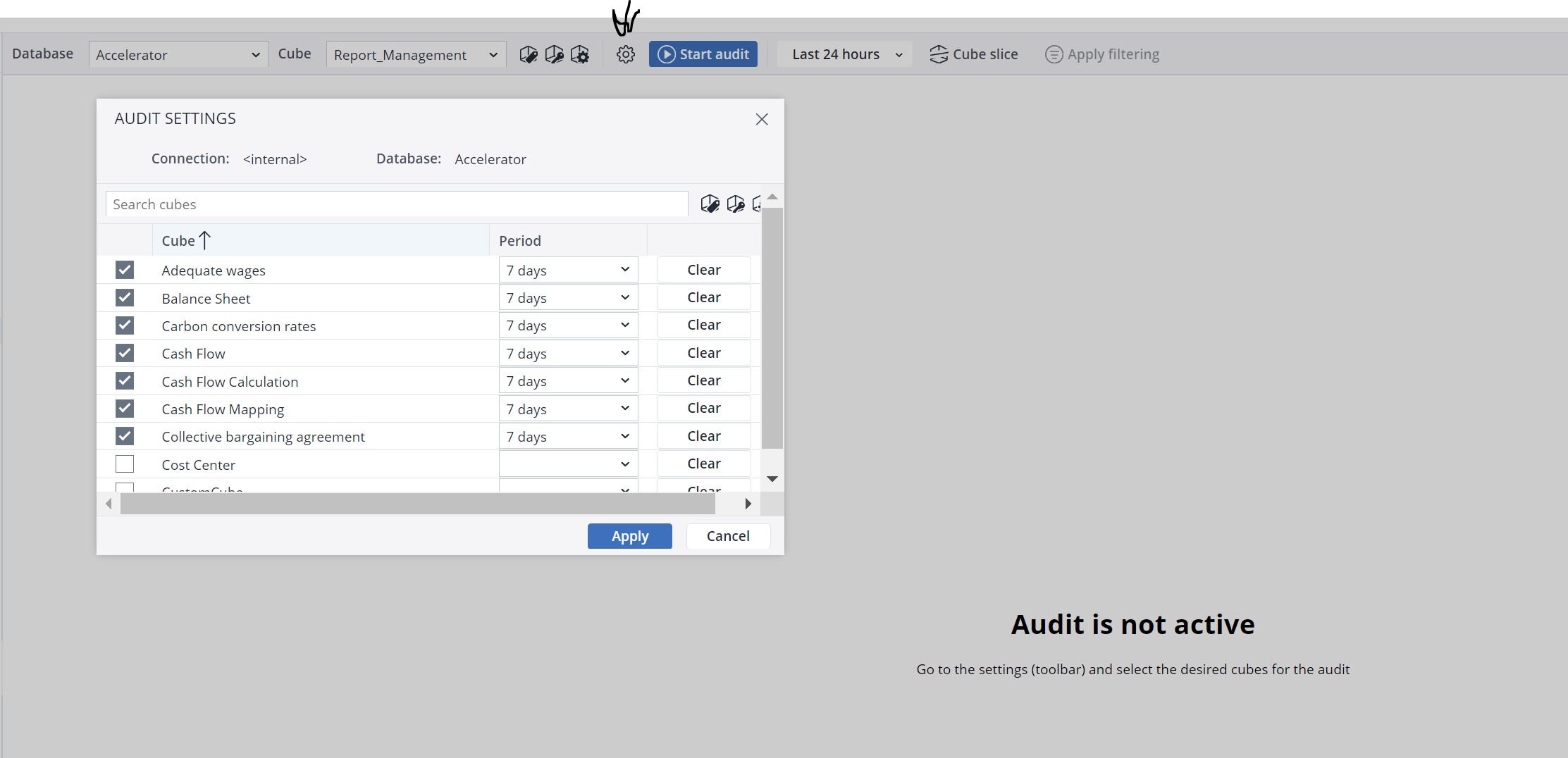 It would be useful to have a setting option to activate audit for all cubes and database. Especially for customers where audit is a requirement, it is easier if this setting can be checked instead of having to remember to set the audit for all cubes.