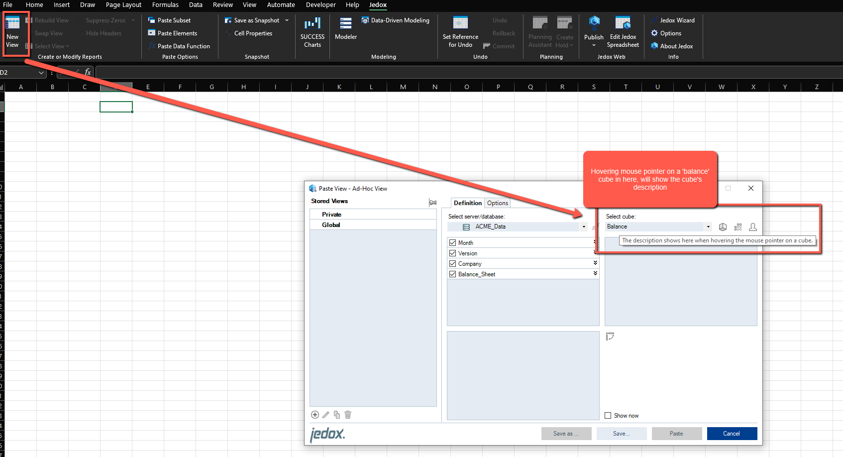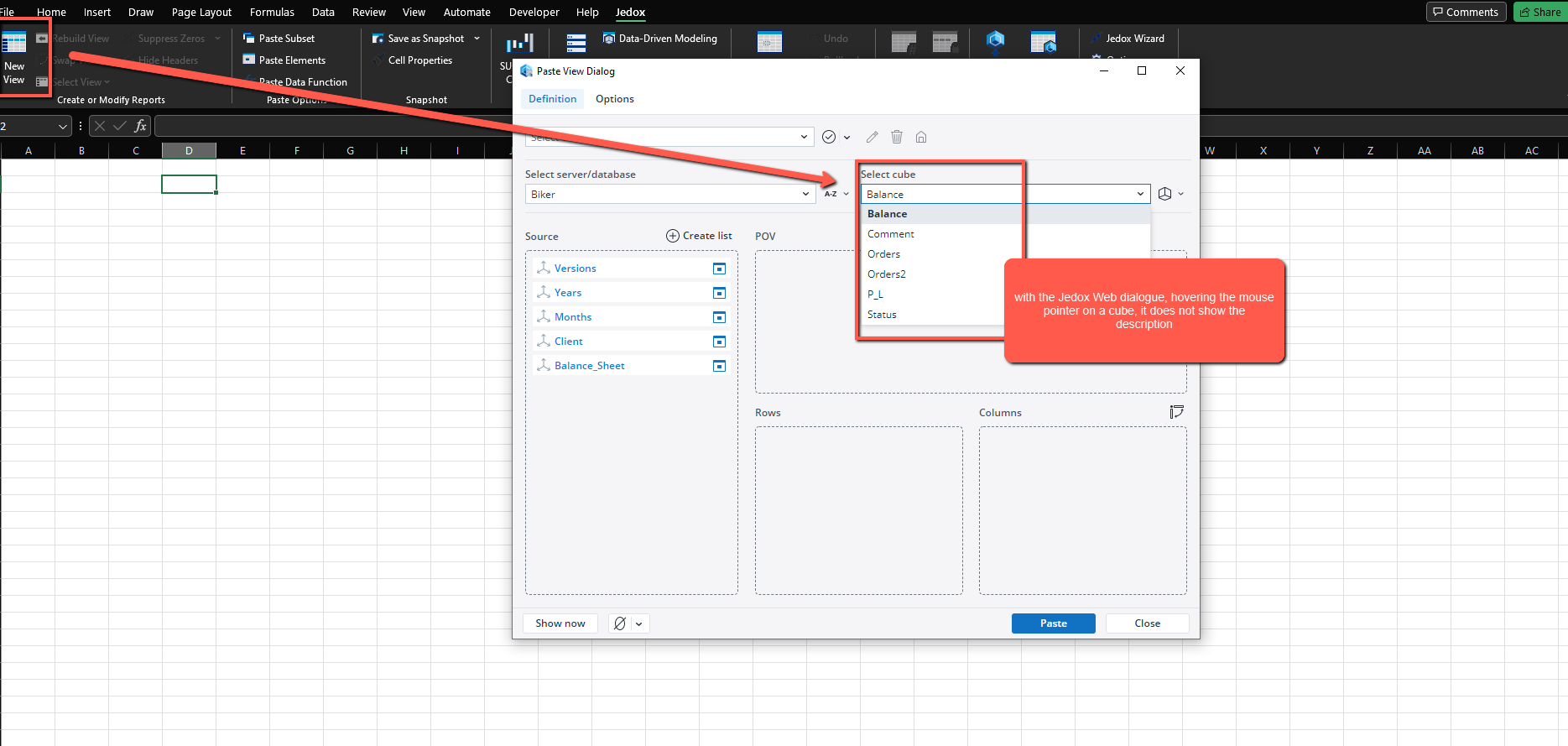 When users utilize the standard dialogues (not the Jedox Web Dialogue) and hover their mouse pointer over a cube in the "paste view" dialog while selecting cubes, they can view the cube's description. This feature greatly enhances the user experience and provides valuable information about the cubes.