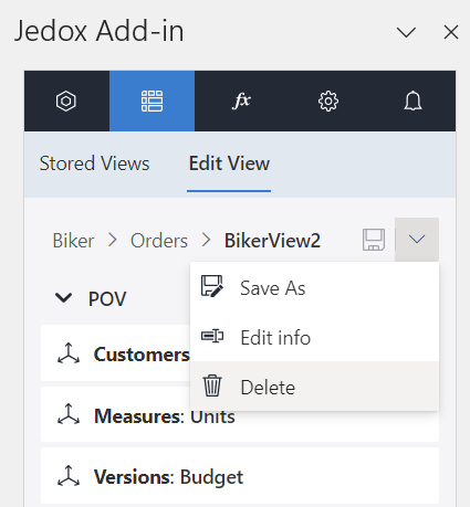 Currently it's only possible to store new views and open existing views in O365 Excel Add-In. It's not possible to delete a stored view. This functionality would be beneficial in the future.