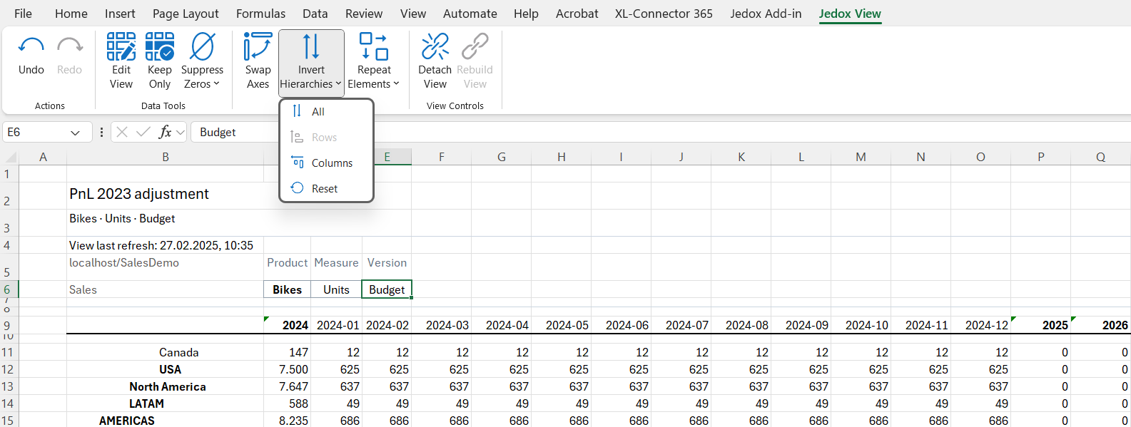 Thank you for sharing your idea! We’re excited to let you know that Separate controls for Parent below Children has been shipped and is now available for all users. We’ve implemented Inverted hierarchies, making it easier for you to apply only on columns, rows, or both. You can access this feature by the Jedox View contextual menu, see image below.
