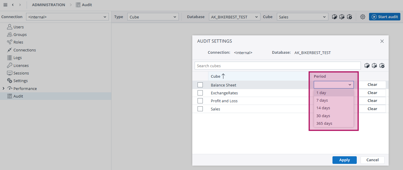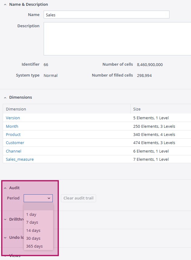 When setting up the audit setting for a cube, the user can only choose between a pre-defined interval (1, 7, 14, 30, 365 days) It would be great to enter an own number of days. Could you make this field open in the modeller cube audit settings and also under administration under category "audit"?