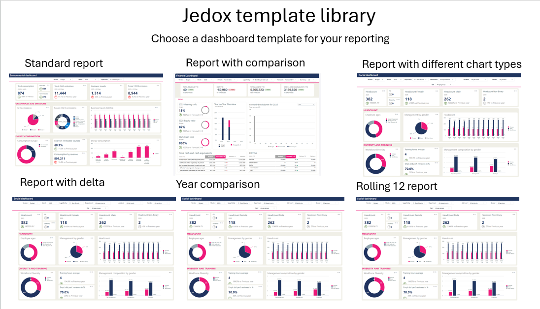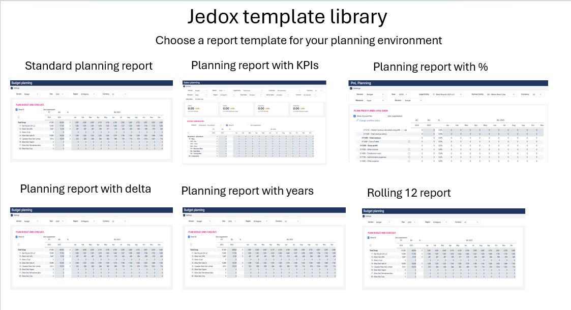 Jedox AI should recognize common reporting and dashboard patterns and offer ready-to-use templates based on real-world best practices. Users could browse a library of report and dashboard layouts tailored to different business areas.