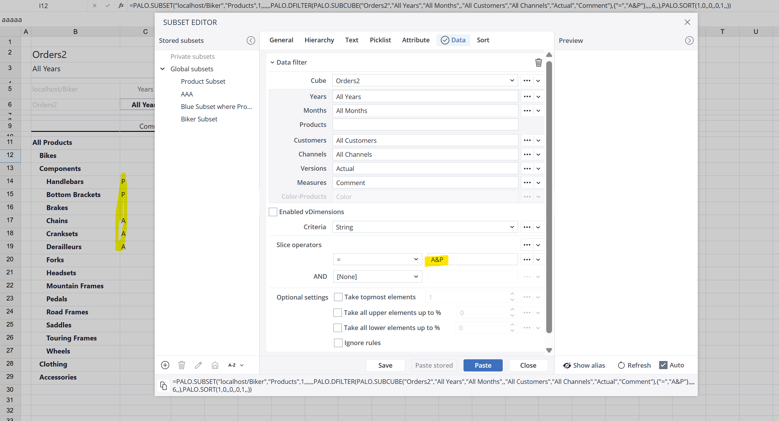 Currently, in the PALO.DFILTER function, filtering based on a string value is limited to only one specific value at a time (e.g., = "Comment a"). This limitation restricts the ability to filter multiple values or patterns dynamically.