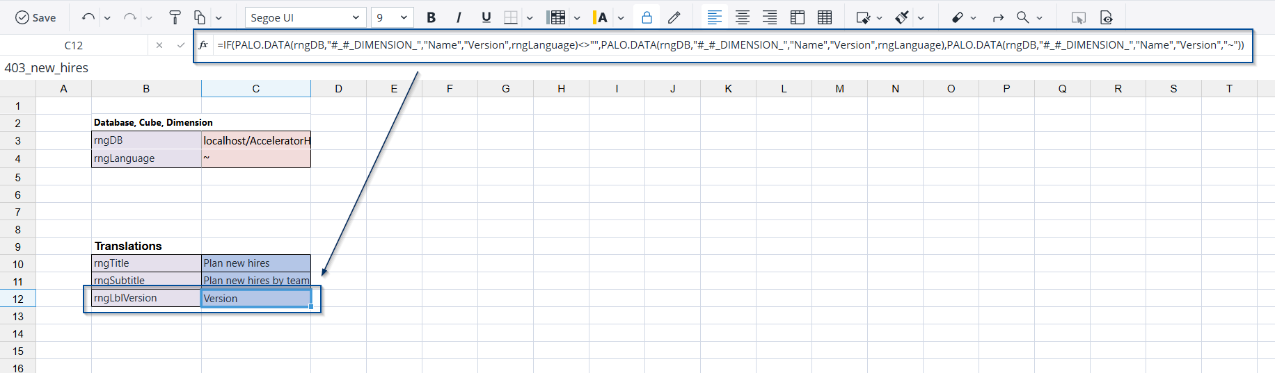 retrieve the dimension name (translated name) in a cell with a palo.data formula