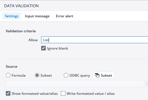 Like in write back (dyna) tables in web spreadsheets it is necessary to define allowed entry values. This means e.g. from a dimension subset or a manual/dynamically defined list. Instead of formulas an expression would make sense.