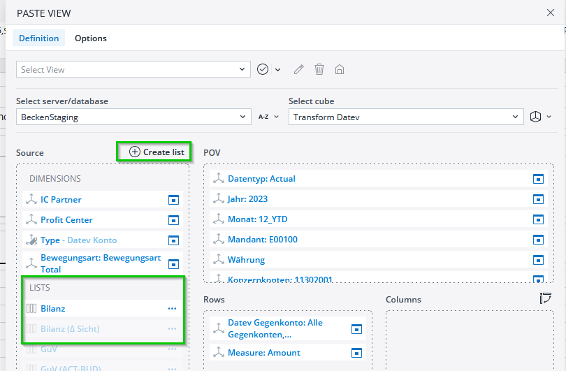 Besides dimensions in rows and columns, there are also lists, which can normally be used for a pivot/ paste view.