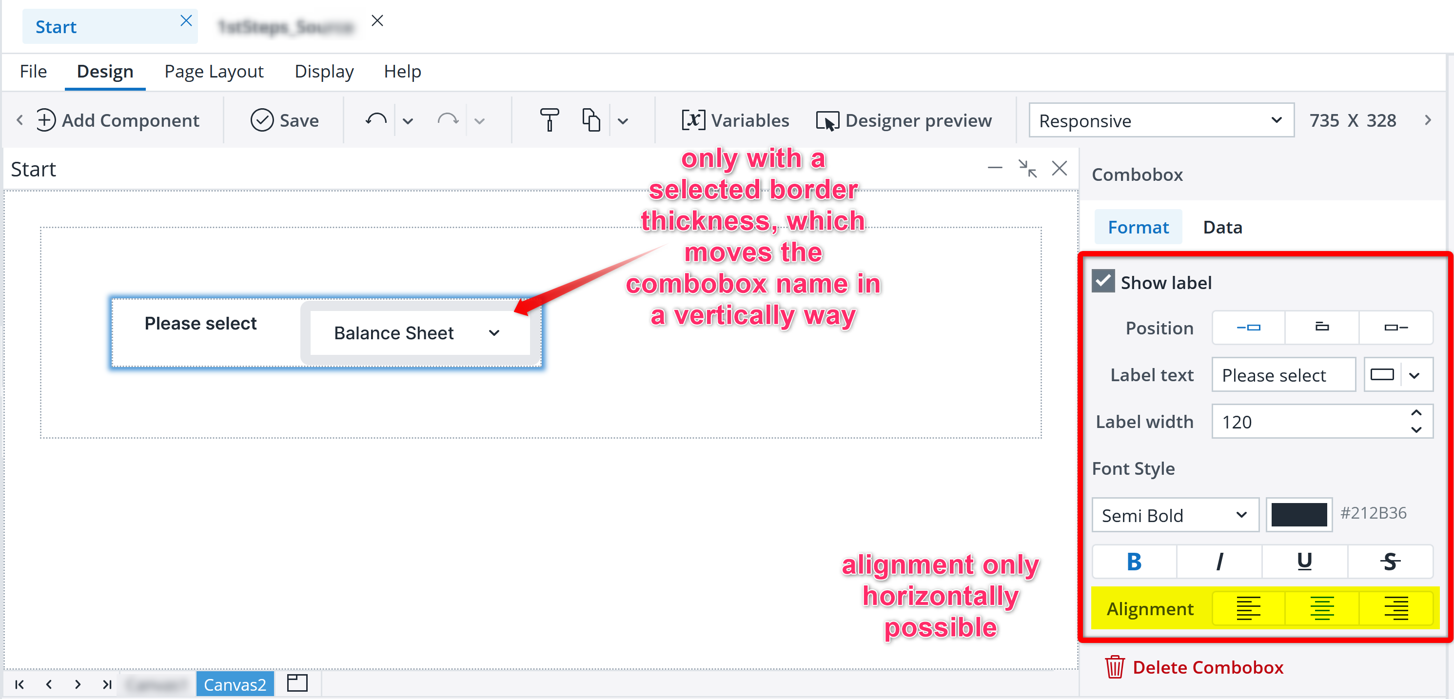 If you add a combobox into a canvas sheet and choose to enable the lable in front of the combobox and additional choose the thickness of the border of the combobox, the label ísn't alligned anymore to the combobox.