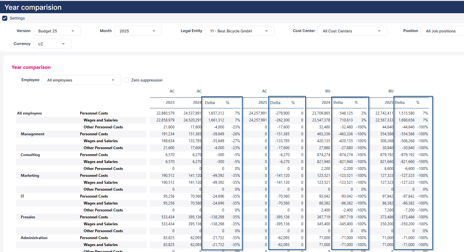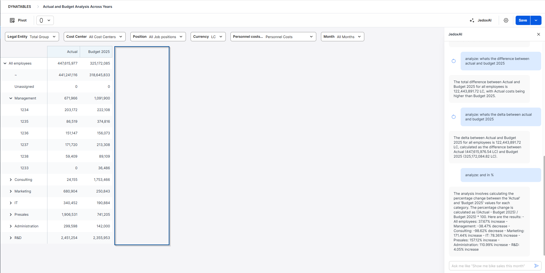 Currently I can view the data of previous year actual and the current year budget. But I cannot see the difference between those numbers in a dynatable. Are we on track as planned? Are we ahead of last year?