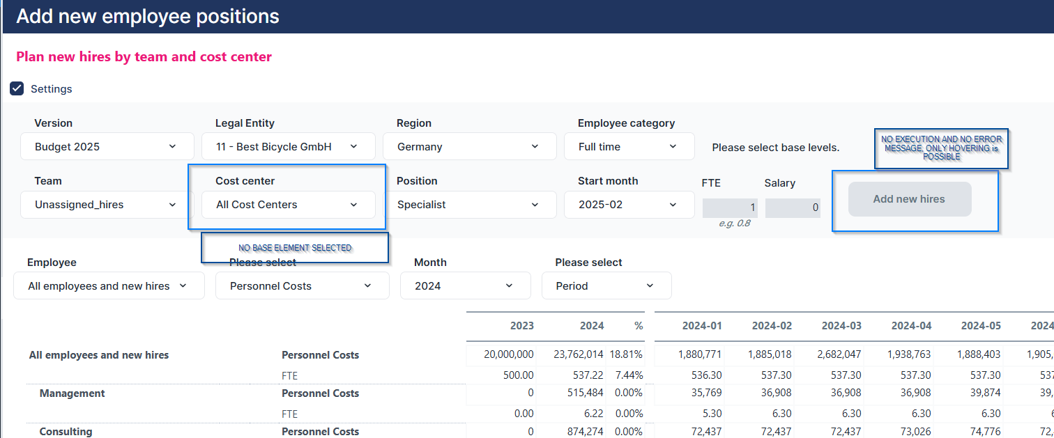 Example: users can currently click on a button and execute an ETL job without selecting the correct (base) elements in the comboboxes (e.g., choosing "All cost centers" is not allowed).