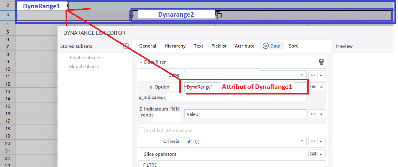In a nested double dynarange, sometimes the dynamic display of dynarange2 does not depend directly on dynarange1. It may depend on one of its attributes. It would be useful to have the ability to call an attribute of dynarange1 as a source for the data filter of dynarange2 — or alternatively, a cell reference that dynamically displays its attribute.