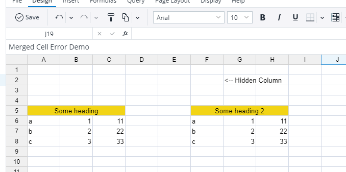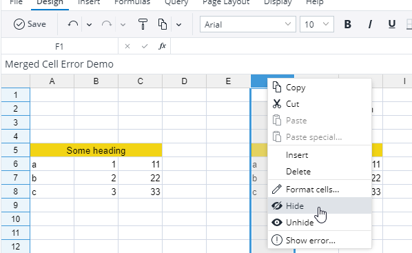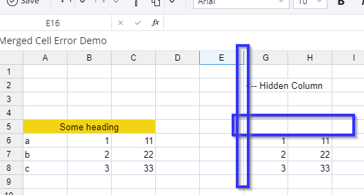 I would like that it did what excel does, namely hide the first column and visually move the content over into the remaining merged cells as if nothing had happened.
