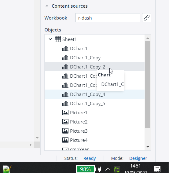 When dropping charts onto a canvas from workbooks with lots of copied charts, the names are impossible to decipher. See screenshot.