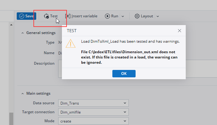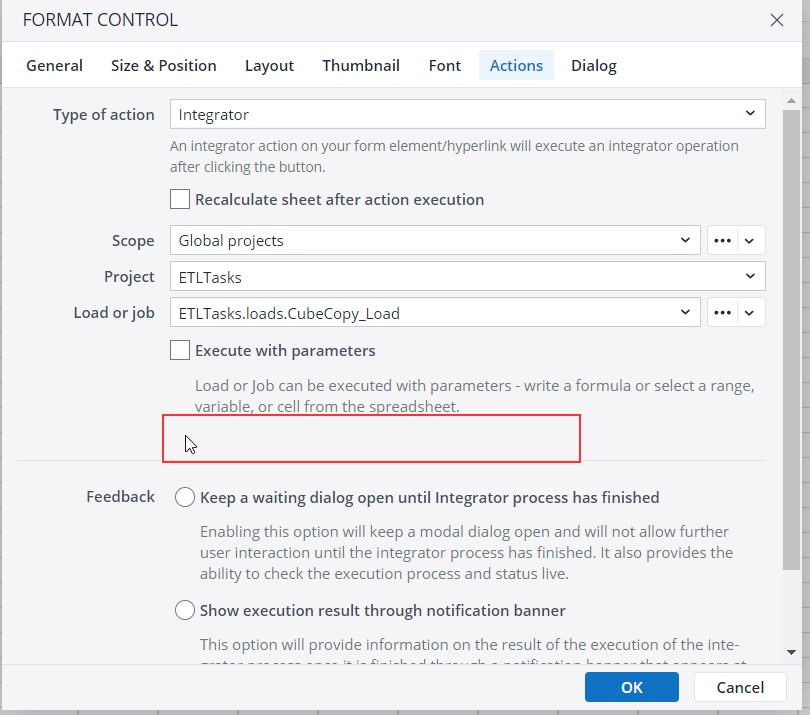 Include a new checkbox in Integrator that when checked, the Action just tests the Integrator load/job in the specified project without actually executing the project. The check box should have the same effect as pressing the "Test" button in a component in Integrator. Any message should come back to the feedback process (modal dialog or banner):