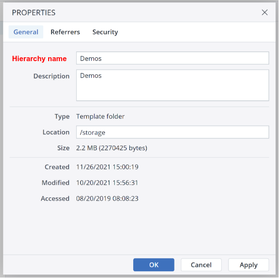 When navigating through the Designer and Reports tabs, and reviewing the properties for "Groups", "Hierarchies" and "Folders" the dialog is missing the description for the element name. (Check mockup)